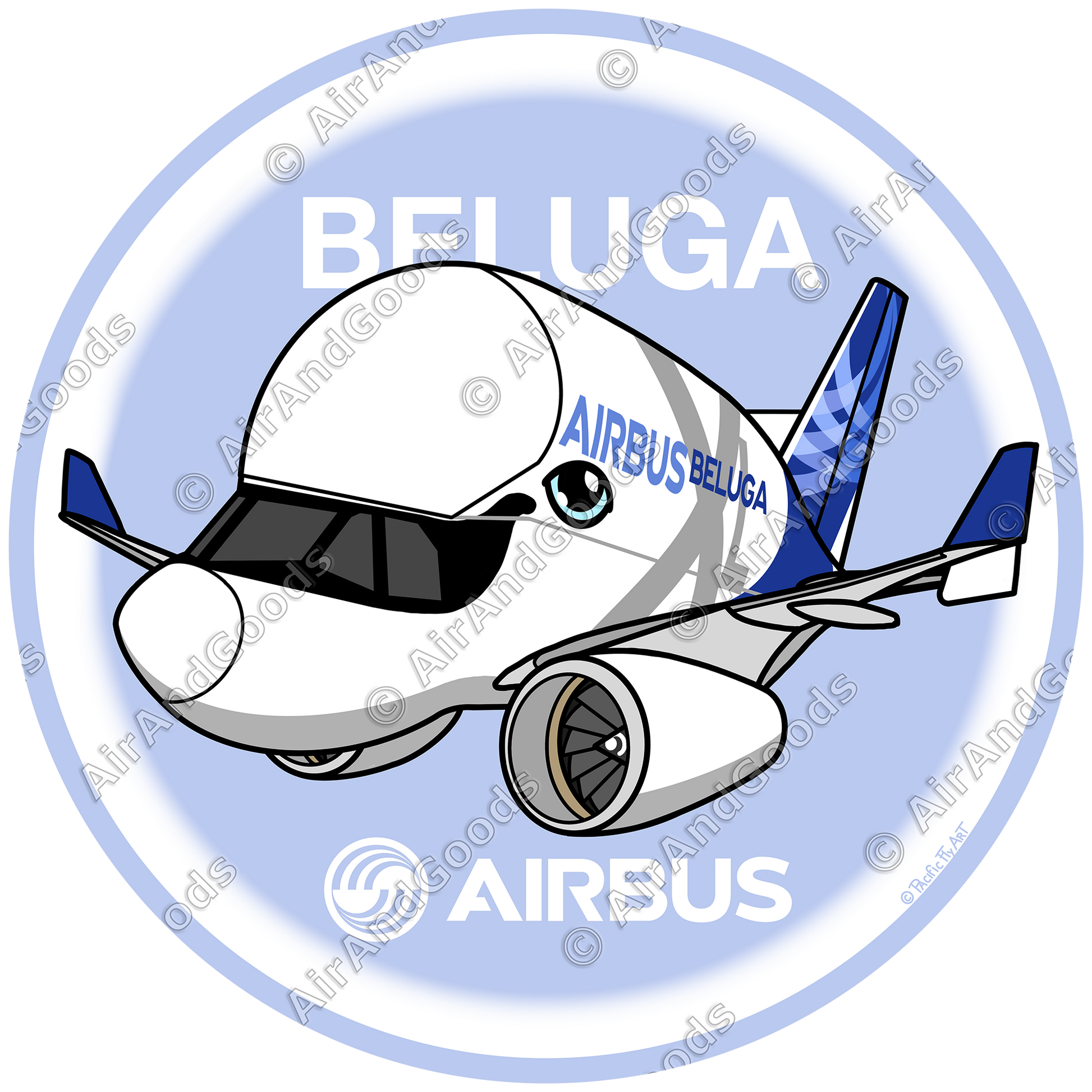 Ce sticker rond de 75 mm illustre un Airbus A330-743L Beluga XL "cartoonisé" aux couleurs de la compagnie française Airbus Transport International.