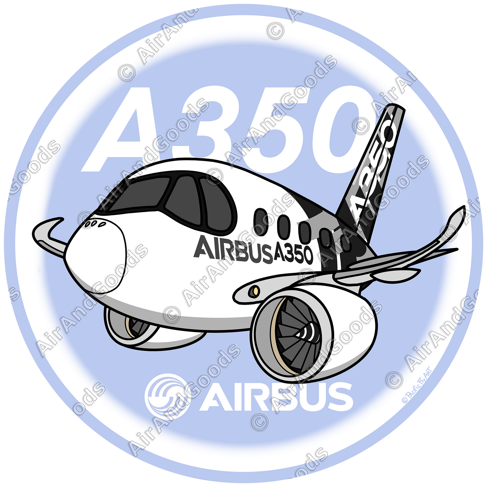 Ce sticker rond de 75 mm illustre un Airbus A350-900 "cartoonisé" aux couleurs du centre Centre d'Essais en Vol d'Airbus. Ce modèle porte une livrée particulière appelée "Carbone".